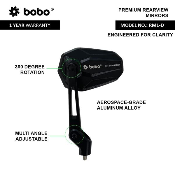 The BOBO RM1 D Mirror combines precision engineering with a bold, sporty appearance. Designed for riders who demand performance and style, it offers unmatched clarity and stability while complementing modern motorcycle designs. Ideal for street, touring, and sport bikes alike.