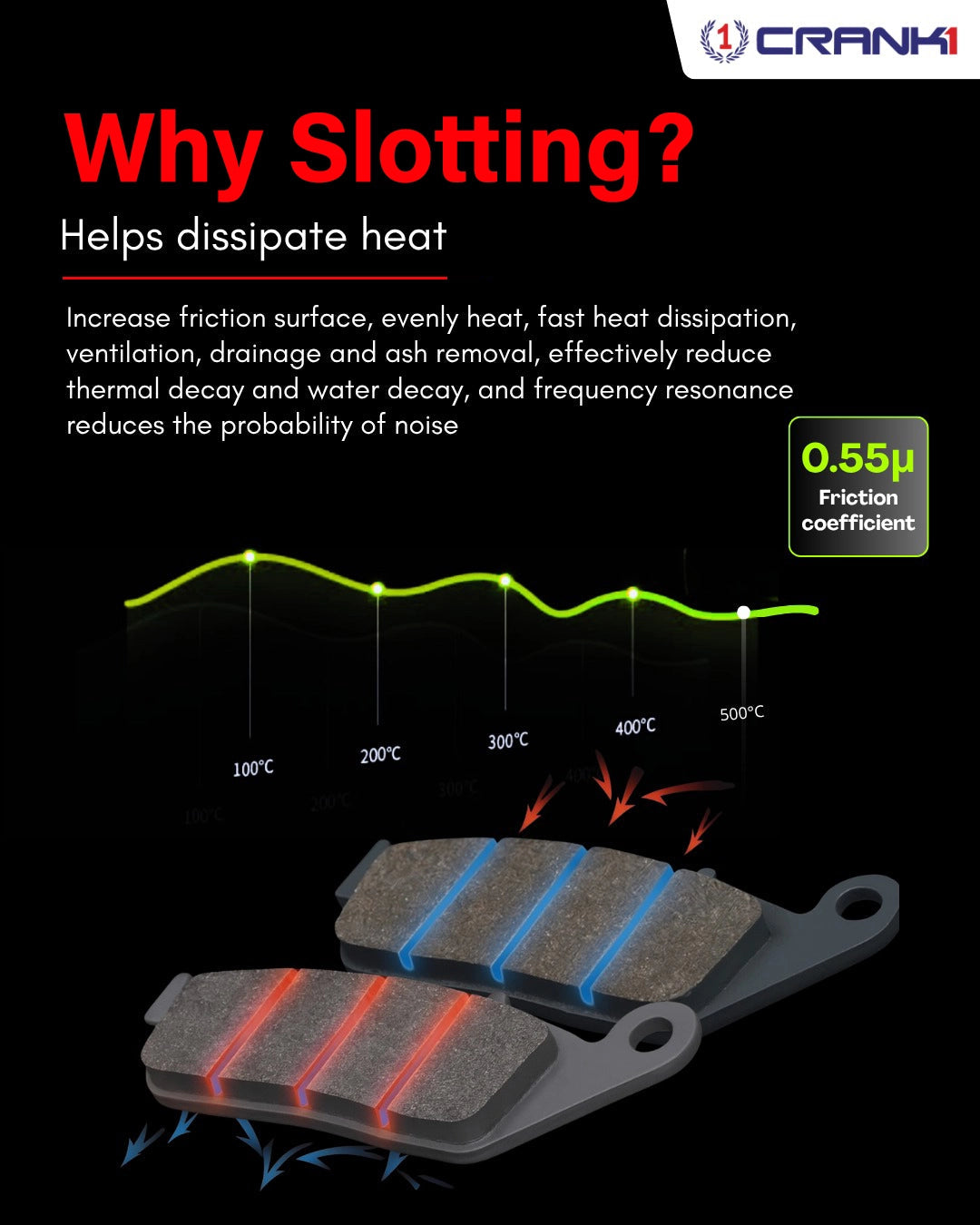 Crank1 carbon special surface treatment promotes heat dissipation and its unique technology ensures indestructible steel back and composite bond & 30% stronger bonding than other brake pads, even with violent cutting – it won’t come off...CRANK1CARBON'sN'sN unique internal microporous structure and fiber arrangement achieves better noise reduction, disc-friendly & thermal balance, and enhances braking comfort, stopping performance, and stability.