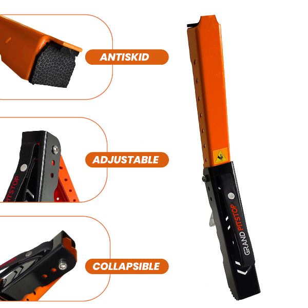 The GrandPitStop Moto Jack is an essential tool for any motorcycle owner. Whether you're changing tires, performing maintenance, or making quick repairs, this jack ensures your bike stays stable and secure. Its compact design makes it portable and easy to store, while the sturdy build ensures it will be a reliable companion for all your motorcycle needs.