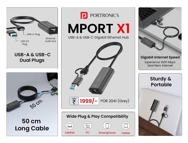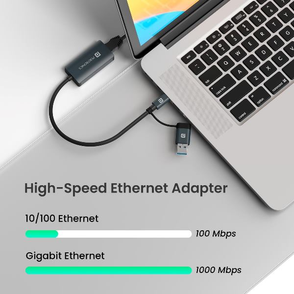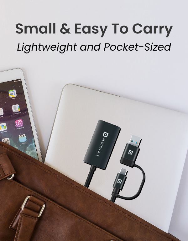 Portronics Mport X1 is a compact and durable 2-in-1 Ethernet Adapter that allows you to convert your USB Type-C or USB-A port into an RJ45 Ethernet port. Designed for high-speed connectivity, it supports up to 1 Gbps Gigabit Ethernet, providing stable and fast internet access for seamless working, gaming, or streaming.