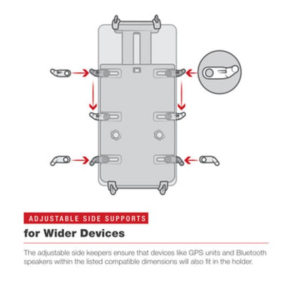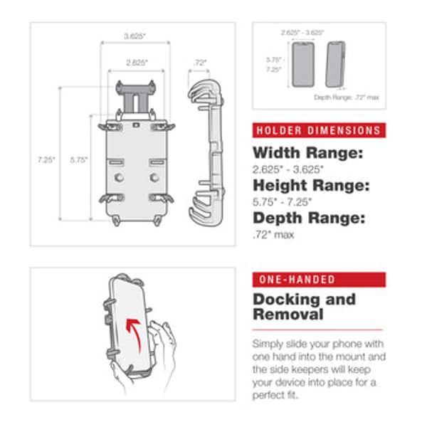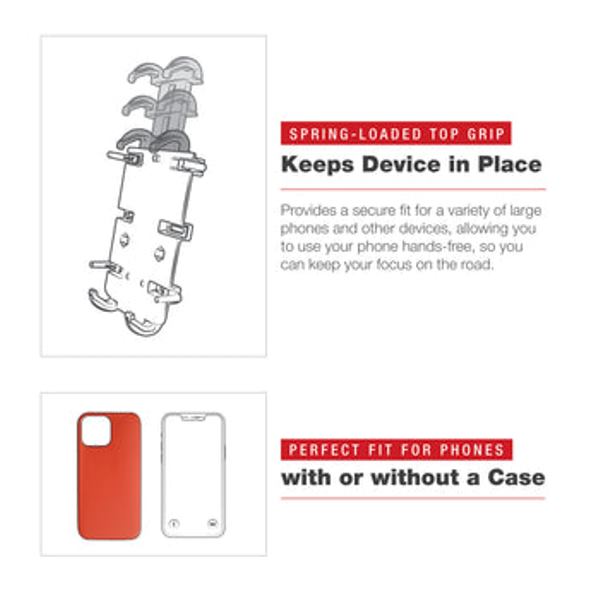 Spring-loaded Quick-Grip™ holder with adjustable side arms fits most large smartphones, even with cases.