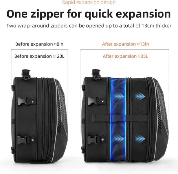 - SCALABLE LARGE CAPACITY: The height of this motorcycle luggage bag can be expanded from 20 cm to 33 cm, and the volume can be expanded from 20L to 35L. There is also a zippered mesh pocket inside, and the compartment design can hold all the belongings you need and take it. are very convenient.