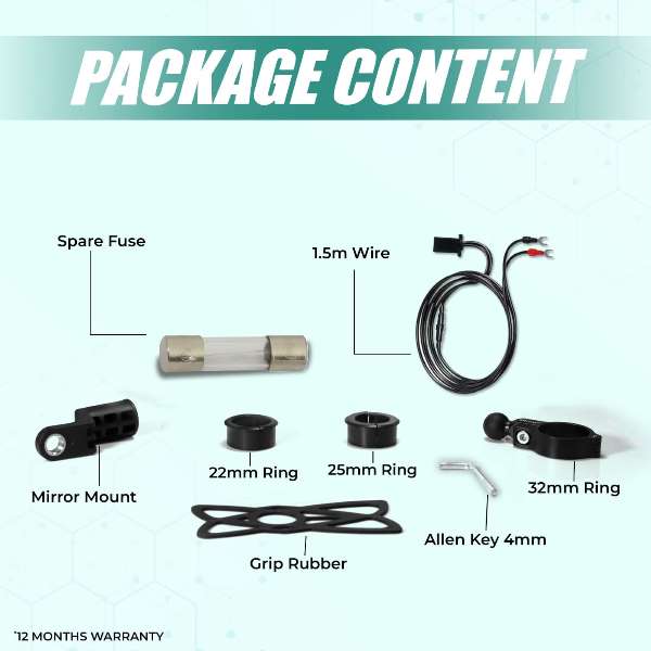 - Suitable for Bikes & Scooters: Comes with adjustable metal buckle (22mm, 25mm, 32mm) and rearview mirror mount — fits most two-wheelers.
