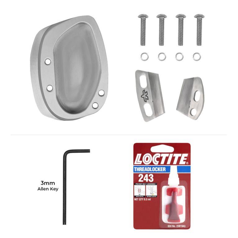 Sidestand shoe top plate – 1 set Sidestand shoe bottom plate – 1 nos no necessary fasteners & washers included (refer to installation manual) Loctite 243 thread locker (0.5ml pack) included Allen key included
