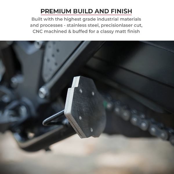 Increases the sidestand footprint by over 2X, distributing weight more evenly and reducing the risk of the bike sinking into soft surfaces like mud, gravel, or sand. -