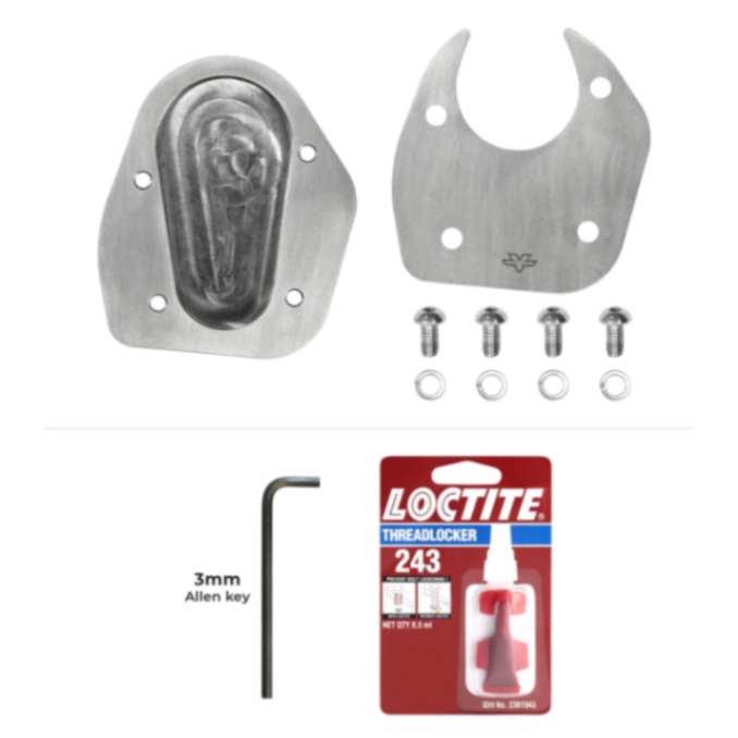 Sidestand shoe top plate – 1nos Sidestand shoe bottom plate – 1 no All necessary fasteners & washers included (refer to installation manual) Loctite 243 thread locker (0.5ml pack) included 3mm Allen key included