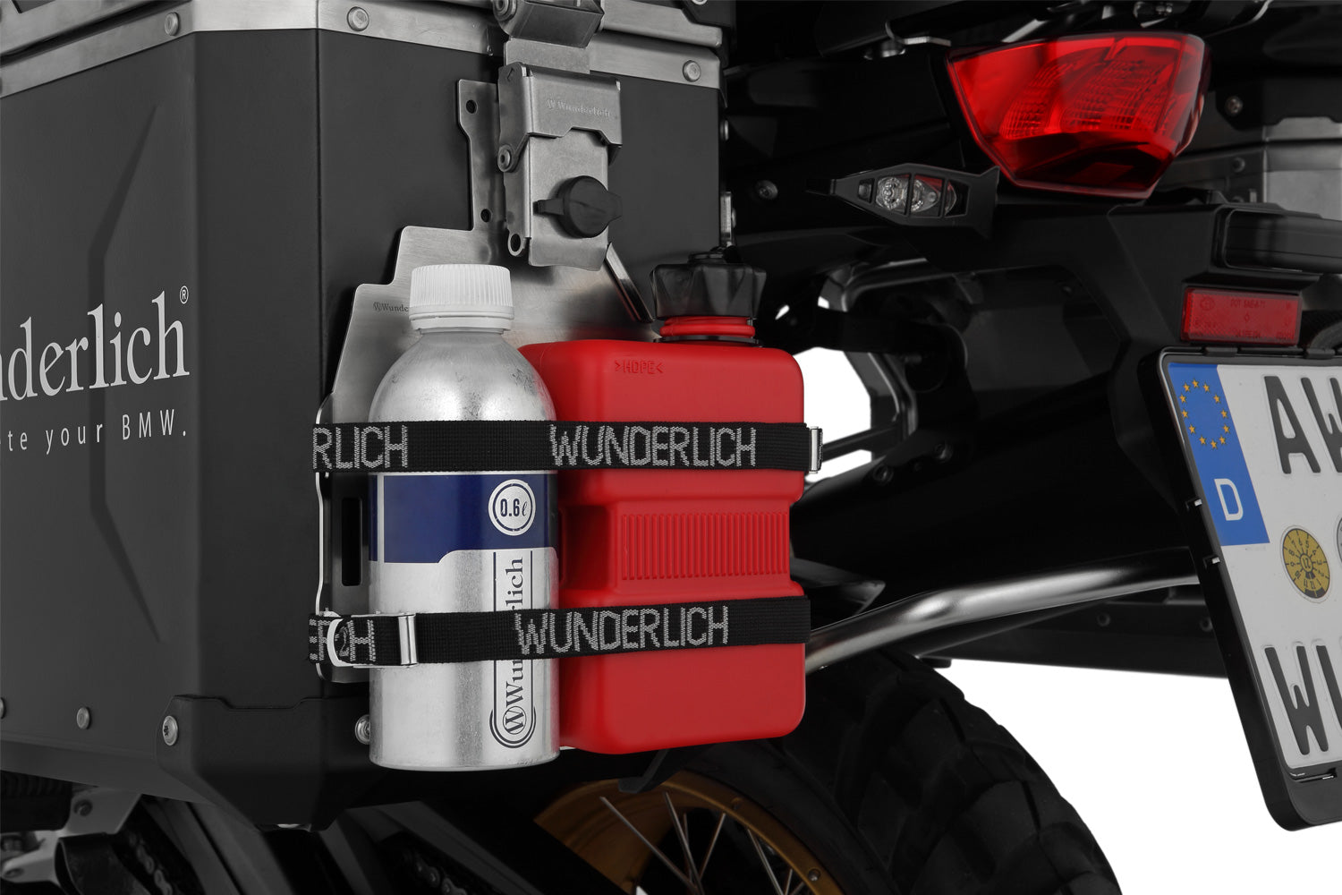 Our case rack is the perfect addition to cases for everything that either needs to be quickly to hand or has no place in a case. It holds the usual travel canisters for petrol and oil bottles as well as compact storage canisters for water or other travel utensils. Who hasn't experienced the annoyance of liquids leaking out - especially when travelling? And the freed-up luggage volume can certainly be used for better things. The solid stainless steel rack is conveniently designed to hold two of our aluminium bottles (art. no. 43583-000) next to each other. In this way, oil and petrol, for example, can be conveniently carried separately. The bottles are secured using straps and the lashing holes are integrated into the rack. Our practical webbing straps (art. no. 25120-012 - please order separately) are perfect for securing all kinds of objects to the rack.