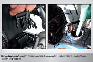 This new tank bag features a solid base which is first attached to the tank. The tank bag is then quickly and easily attached to the base plate by means of a tab that fits into the base plate. Removal is just as simple and for those bikes where the “tank” is really a tank, we have designed an easy access flap to the filler, so that the base can remain in place. The Tank Bag Light differs in size from the Tank Bag Elephant; it has a maximum capacity of 15 litres and can not be expanded