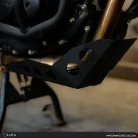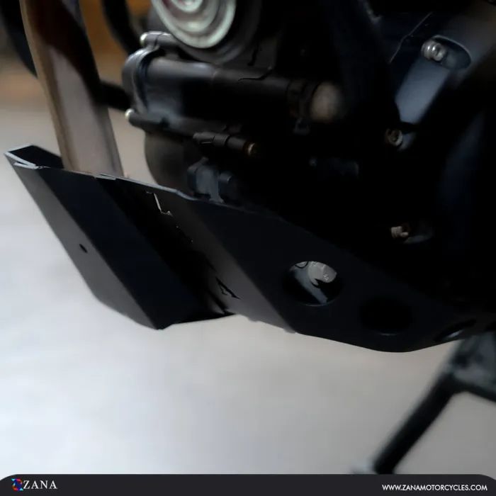 Bash Plate for Royal Enfield Guerrilla 450 by ZANA MOTORCYCLES provides durable protection and stylish design for off-road enthusiasts. Crafted from mild steel (MS), this bash plate is engineered to protect the oil filter and engine from debris and impact, making it an essential accessory for rugged terrains.